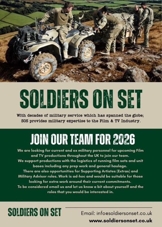Soldiers on Set has a range of roles for current and ex military personnel interested in being involved in film and television productions. From general haulage to supporting artistes (extras), there are plenty of ad-hoc opportunities. Get in touch with Soldiers on Set to find out more.